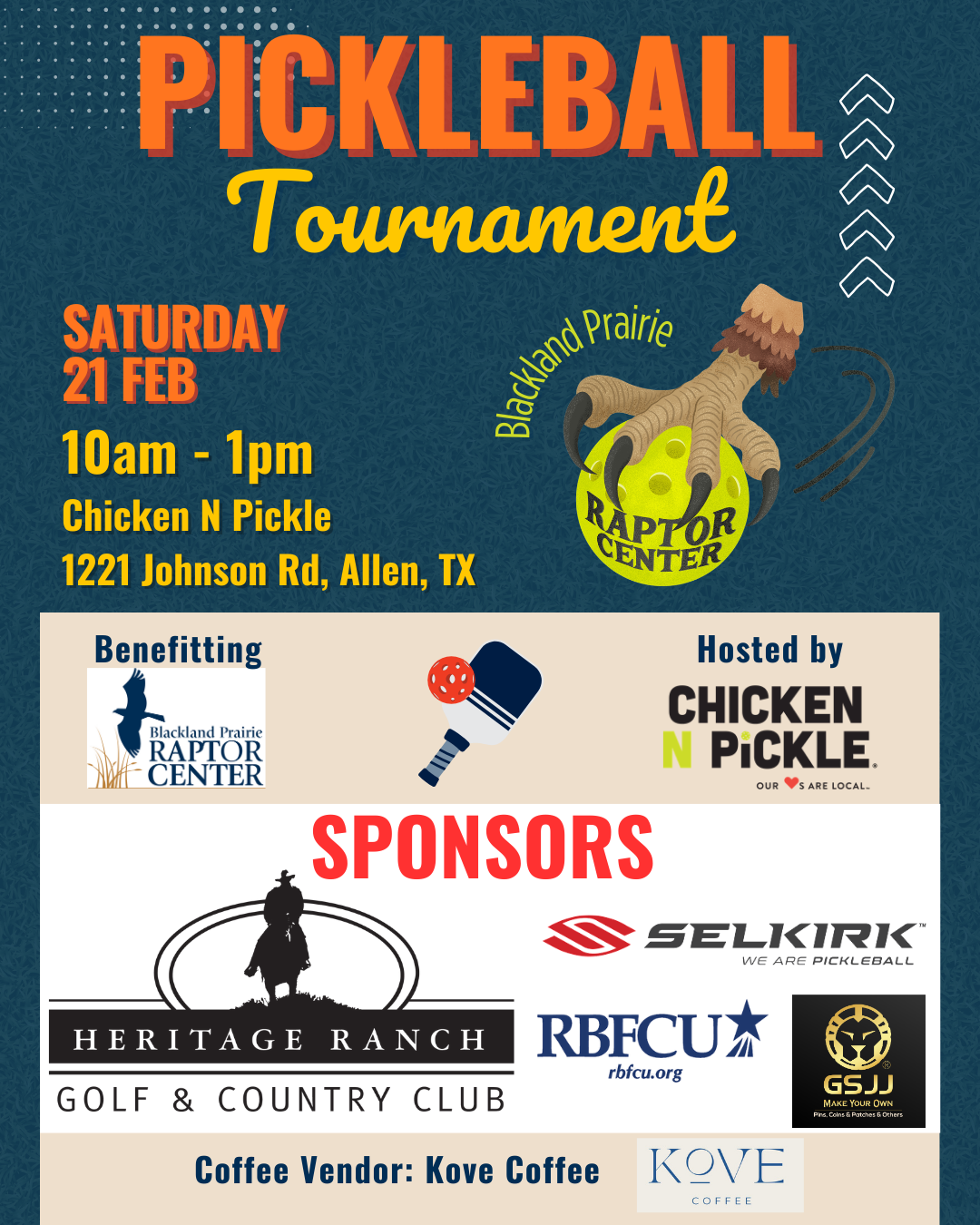 Join us for the 1st Annual Blackland Prairie Raptor Center (BPRC) Pickleball Tournament, hosted by Chicken N Pickle! All ages and all skill levels are welcomed!